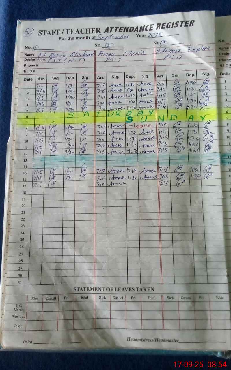 | CNIC | Full Name | Designation | R/C | Absence During Last Calender Month |