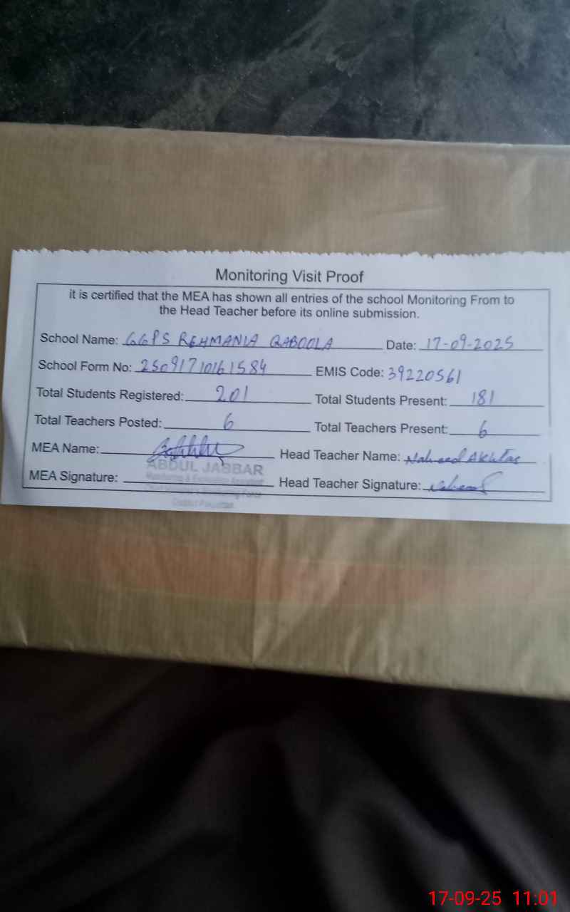 | EMIS Code: 39220561 | Name of School: GGPS REHMANIA QABOOLA | |||