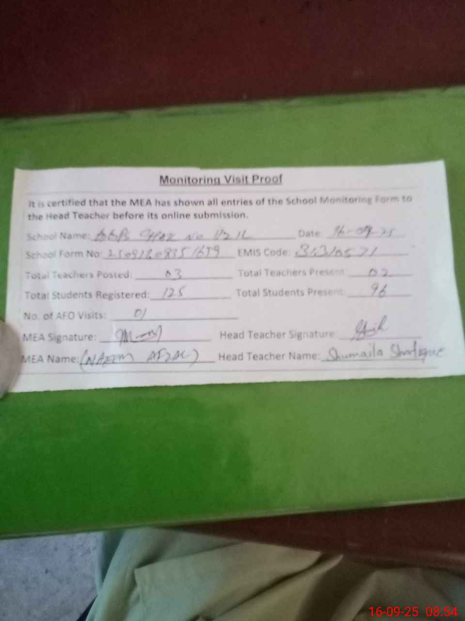 | Attendance Register | Head Teacher | MEA with School | Visit Proof |