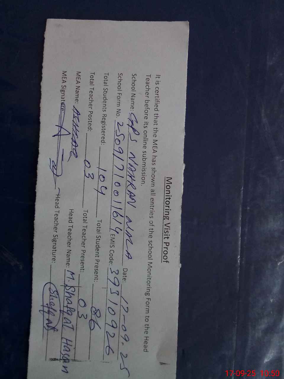 | Attendance Register | Head Teacher | MEA with School | Visit Proof |