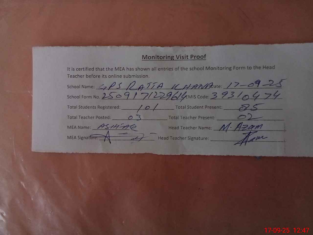 | Attendance Register | Head Teacher | MEA with School | Visit Proof |