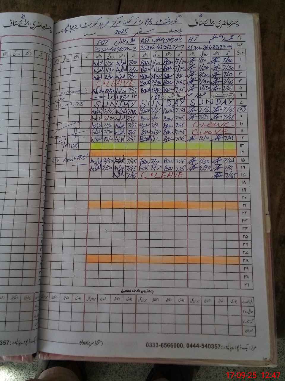 | CNIC | Full Name | Designation | R/C | Absence during last cal. month |