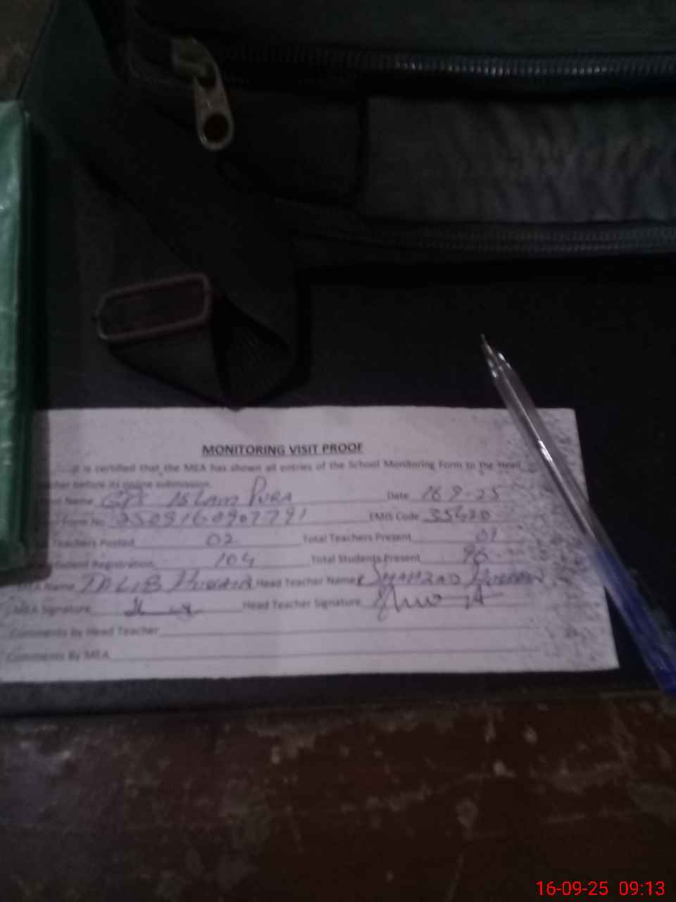 | Attendance Register | Head Teacher | MEA with School | Visit Proof |