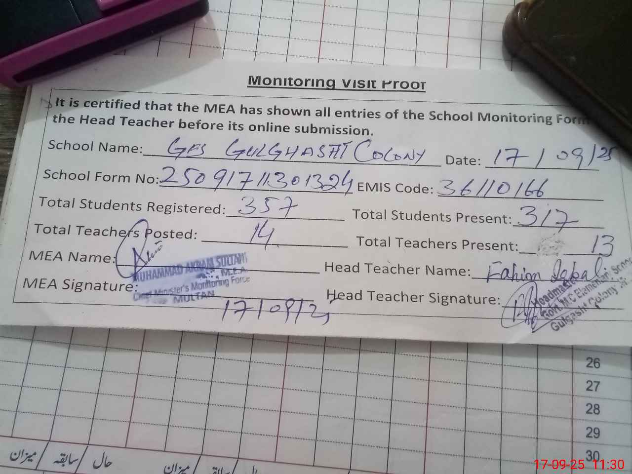 | Attendance Register | Head Teacher | MEA with School | Visit Proof |