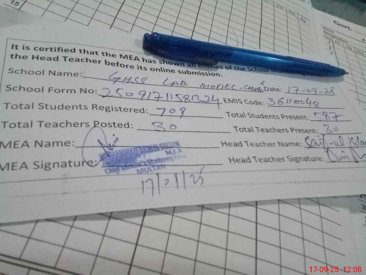 | EMIS Code: 36110048 | Name of School: GHSS LAB. MODEL CHUNGI NO.6 MULTAN | |||
