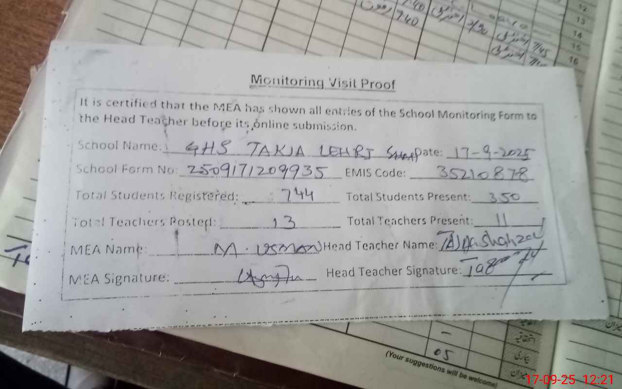 | EMIS Code: 35210878 | Name of School: GHS TAKIA LEHRI SHAH (EX-MCL) | |||