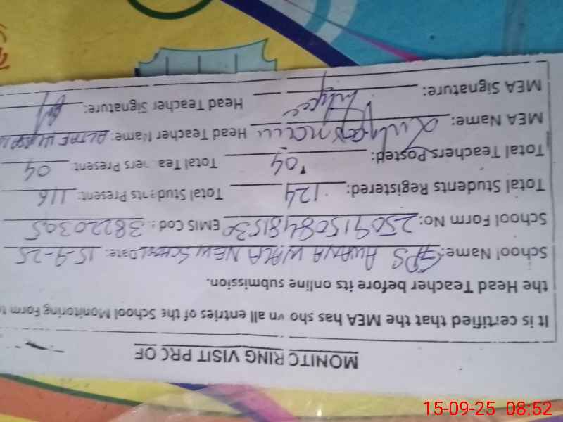 | Attendance Register | Head Teacher | MEA with School | Visit Proof |
