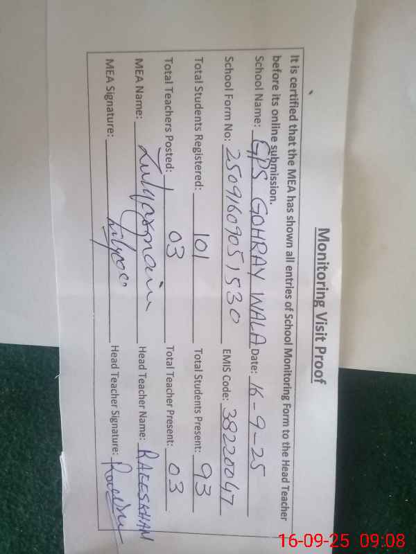 | EMIS Code: 38220047 | Name of School: GPS GOHRAY WALA | |||