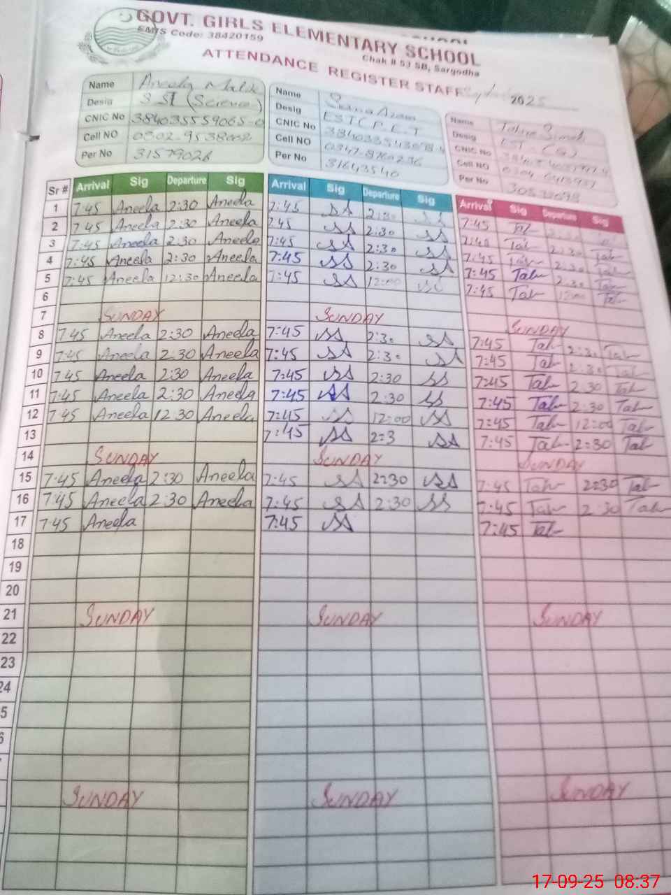 | CNIC | Full Name | Designation | R/C | Absence during last cal. month |