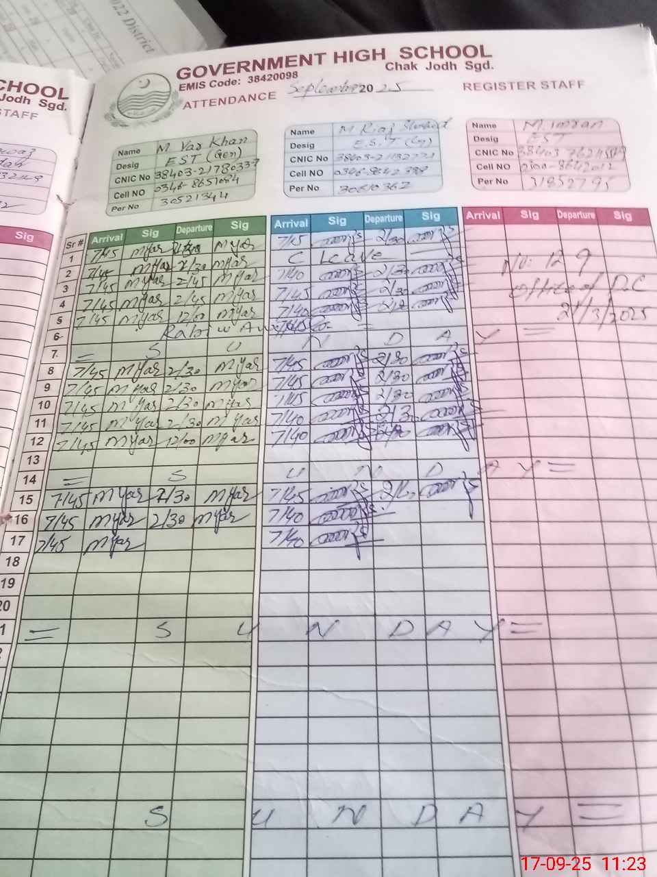 | CNIC | Full Name | Designation | R/C | Absence during last cal. month |