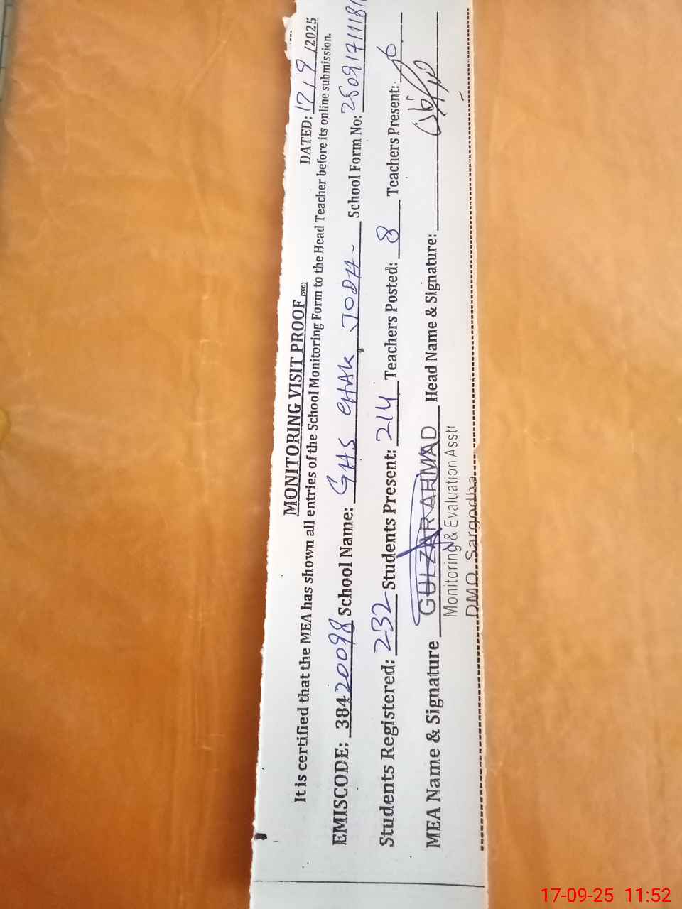 | Attendance Register | Head Teacher | MEA with School | Visit Proof |