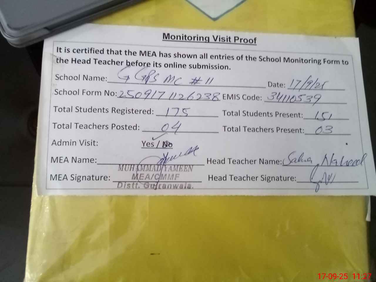 | EMIS Code: 34110539 | Name of School: GGPS MC NO.11 GUJRANWALA | |||
