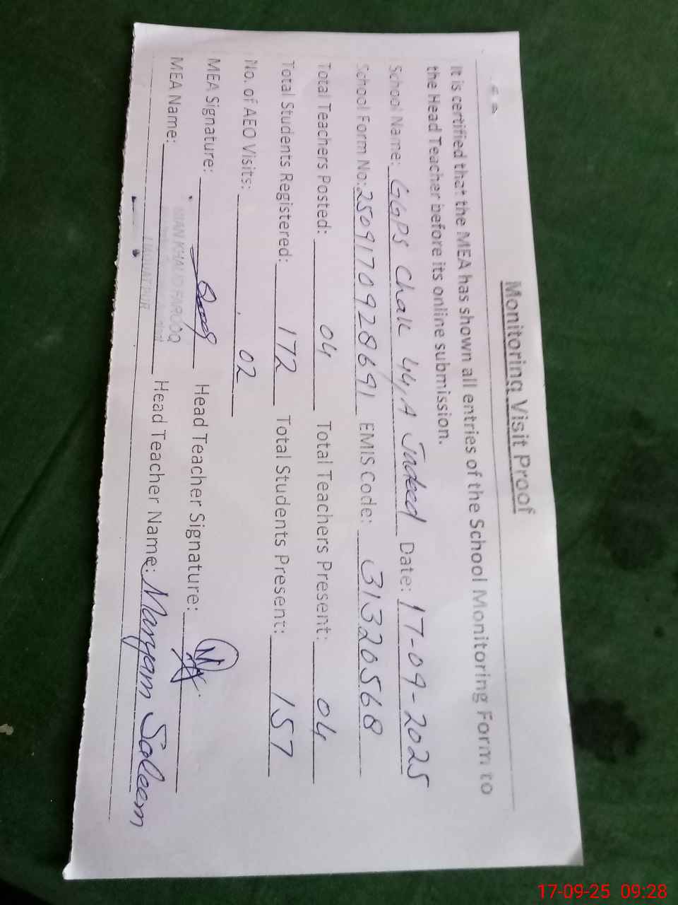 | Attendance Register | Head Teacher | MEA with School | Visit Proof |