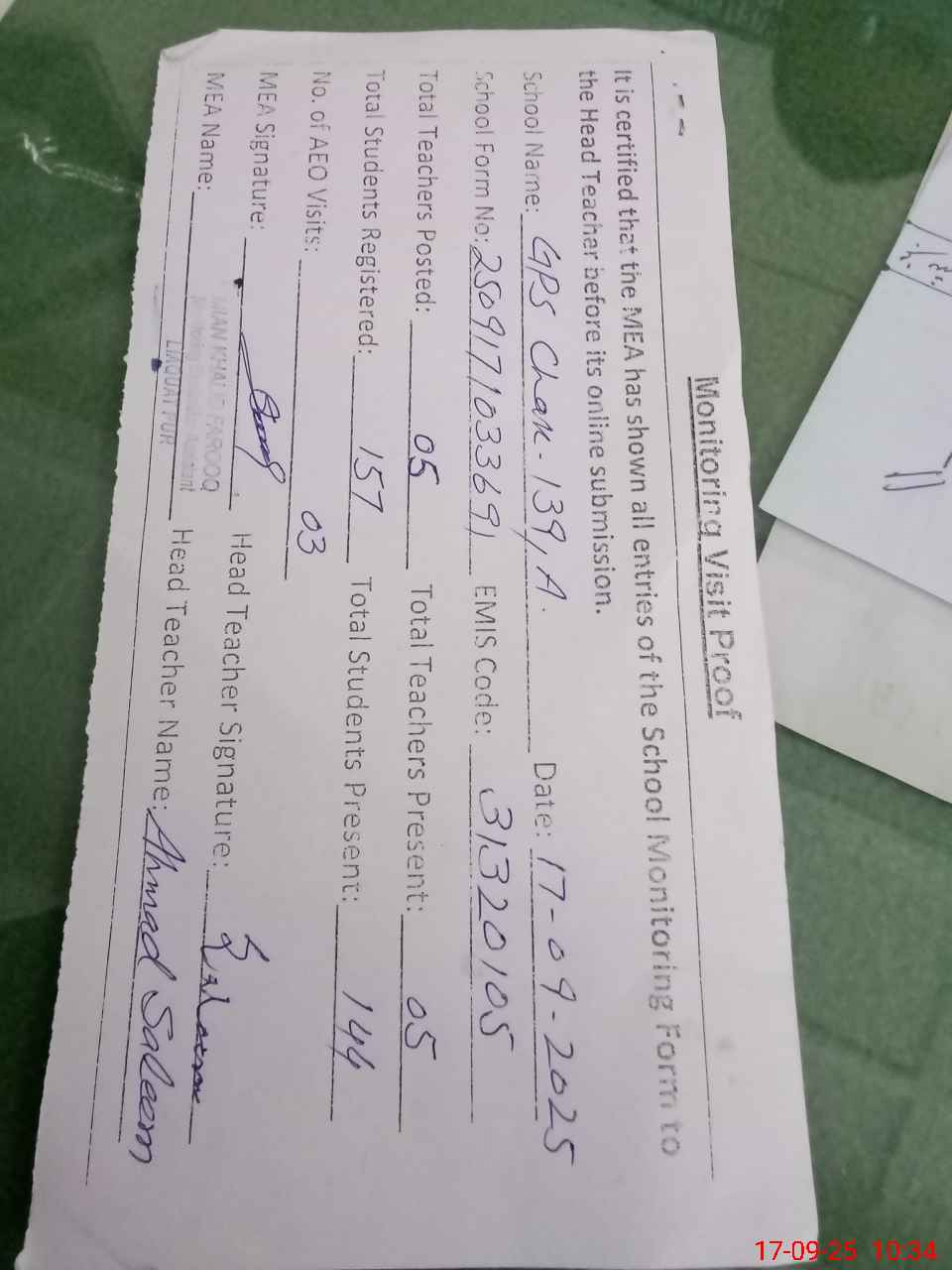 | Attendance Register | Head Teacher | MEA with School | Visit Proof |