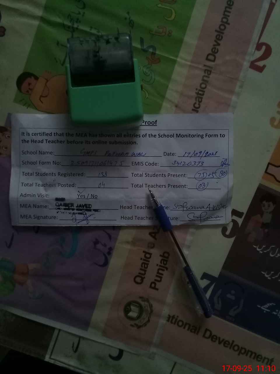 | EMIS Code: 34120373 | Name of School: GMPS PATHAN WALI | |||
