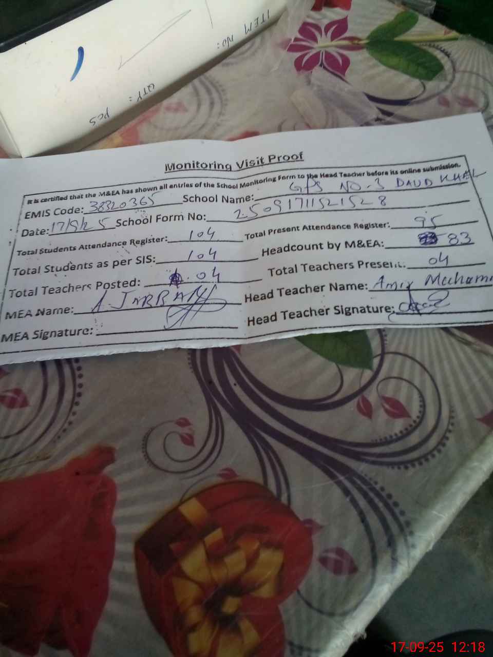 | EMIS Code: 38320365 | Name of School: GPS NO. 3 DAUD KHEL | |||