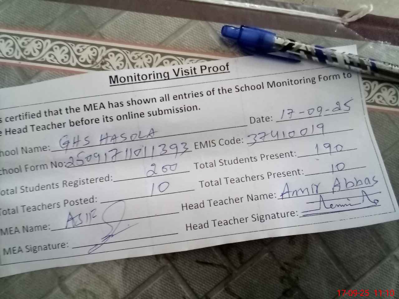 | Attendance Register | Head Teacher | MEA with School | Visit Proof |