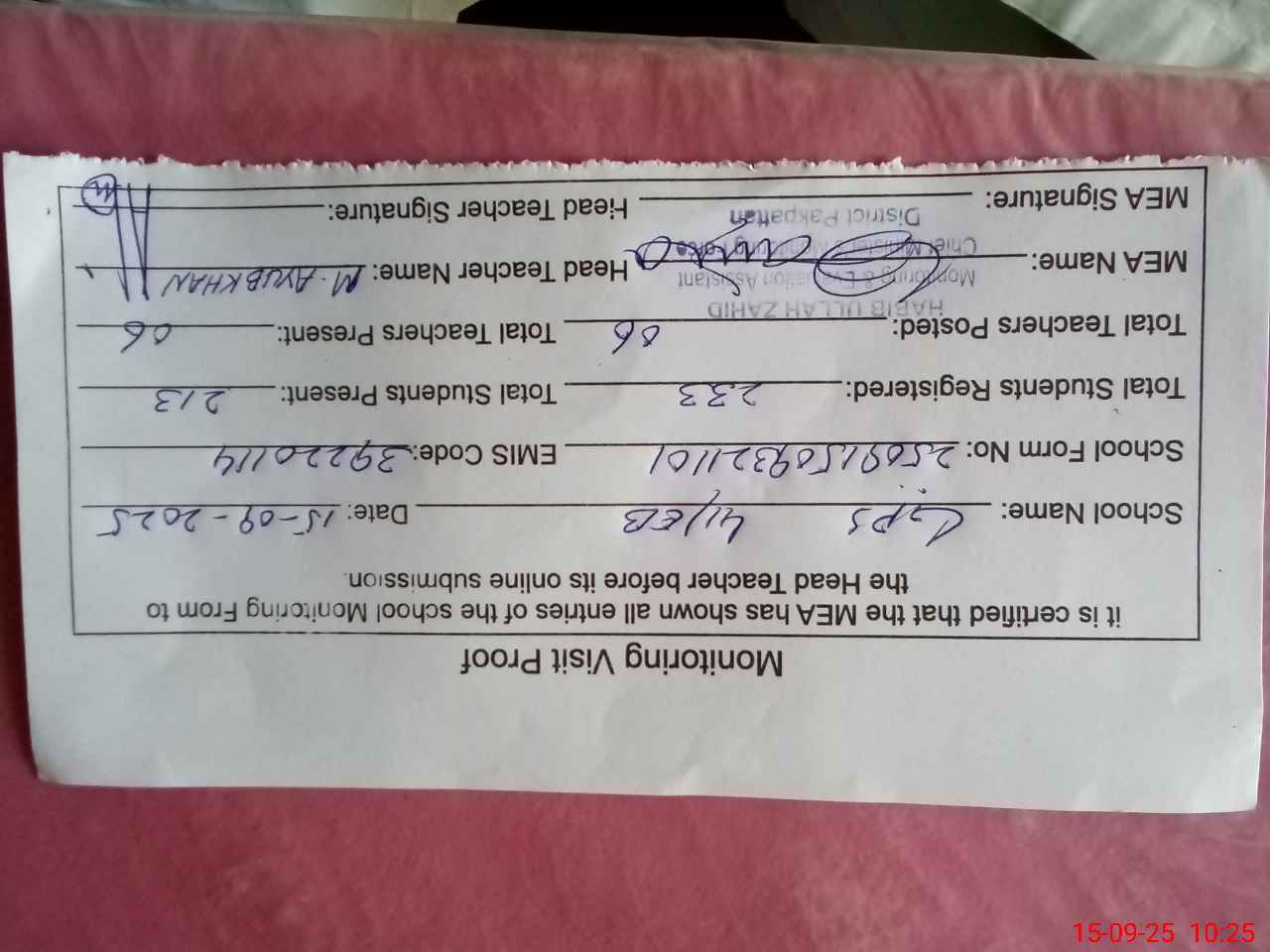 | Certified that this School was Inspected by the Undersigned MEA/DMO Today and the Information Stated Above is as Per Record. | |||||