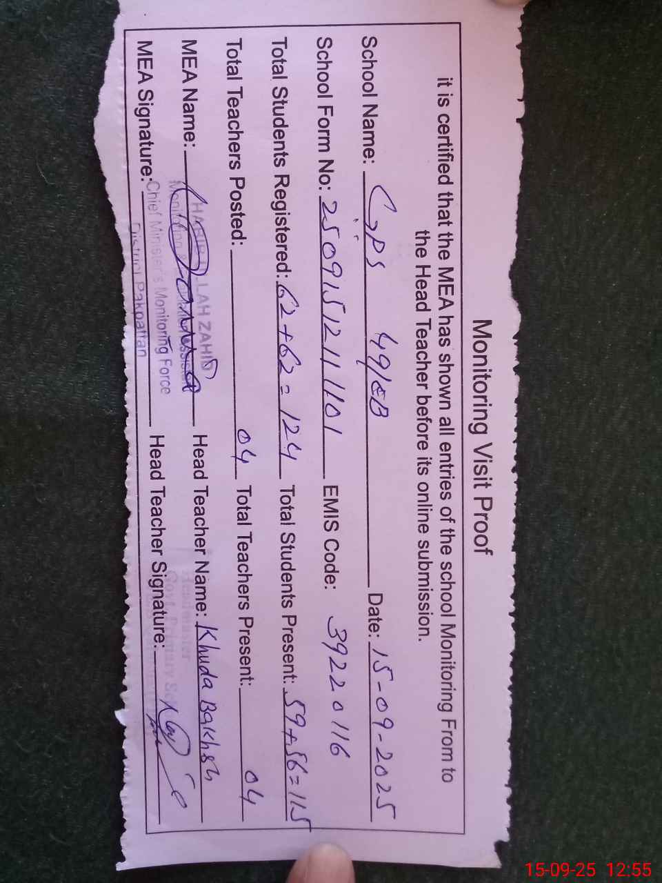| Attendance Register | Head Teacher | MEA with School | Visit Proof |
