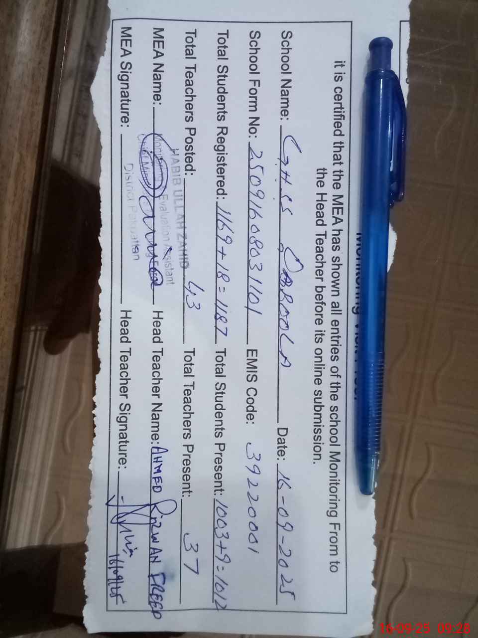 | Certified that this School was Inspected by the Undersigned MEA/DMO Today and the Information Stated Above is as Per Record. | |||||