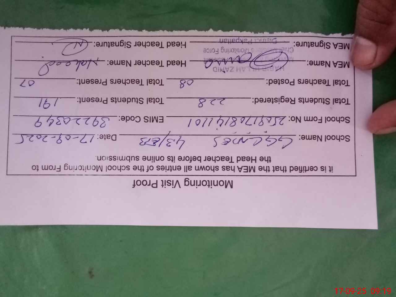 | Attendance Register | Head Teacher | MEA with School | Visit Proof |