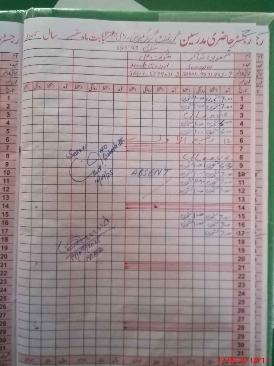 | 36**** | Sh**** Al**** | NAIB QASID | Regular | 0 | 0 | 30 | 0 | 0 | 0 | 0 | 0 | 0 | Absent (Un-Authorized) |