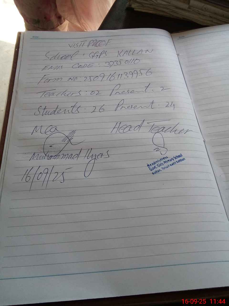 | Attendance Register | Head Teacher | MEA with School | Visit Proof |