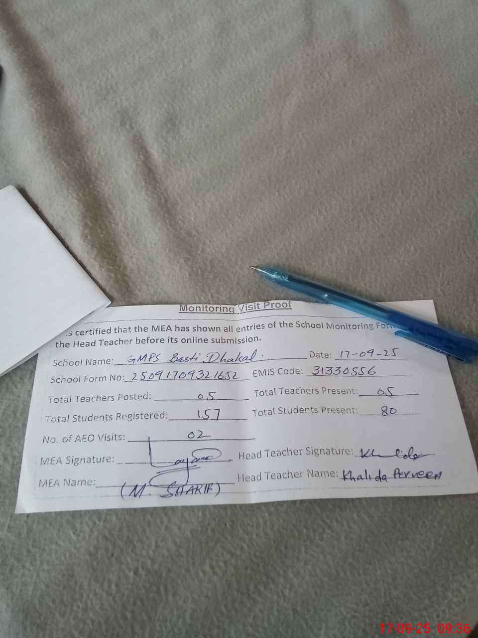| Attendance Register | Head Teacher | MEA with School | Visit Proof |