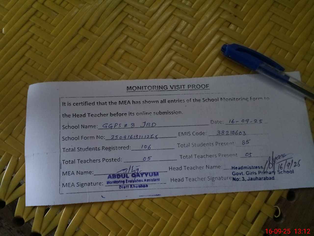 | EMIS Code: 38210603 | Name of School: GGPS NO. 3 JOUHAR ABAD | |||