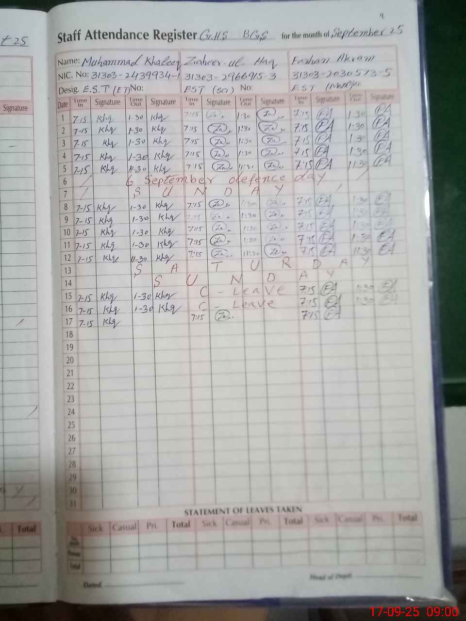 | CNIC | Full Name | Designation | R/C | Absence During Last Calender Month |