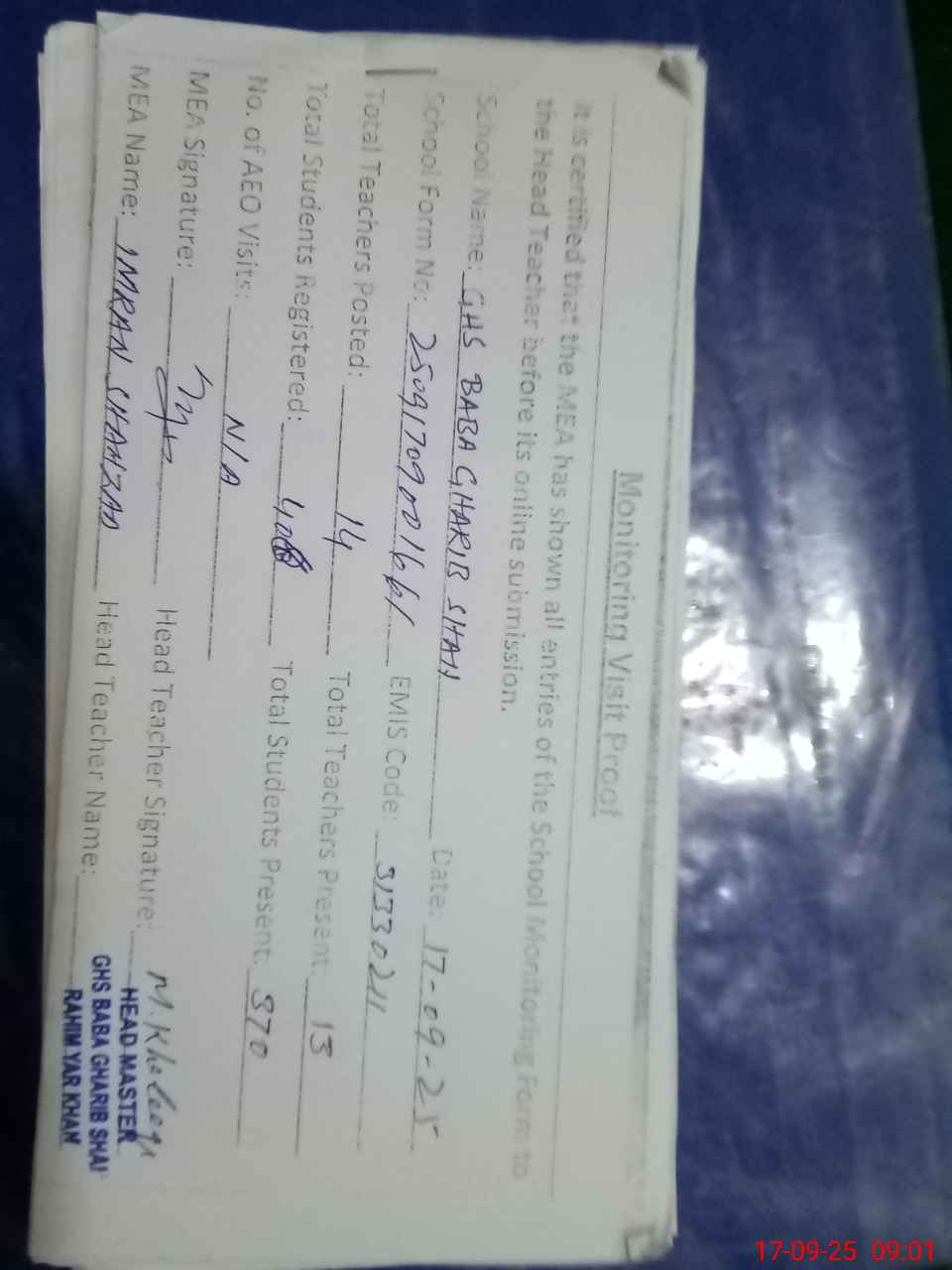 | Attendance Register | Head Teacher | MEA with School | Visit Proof |