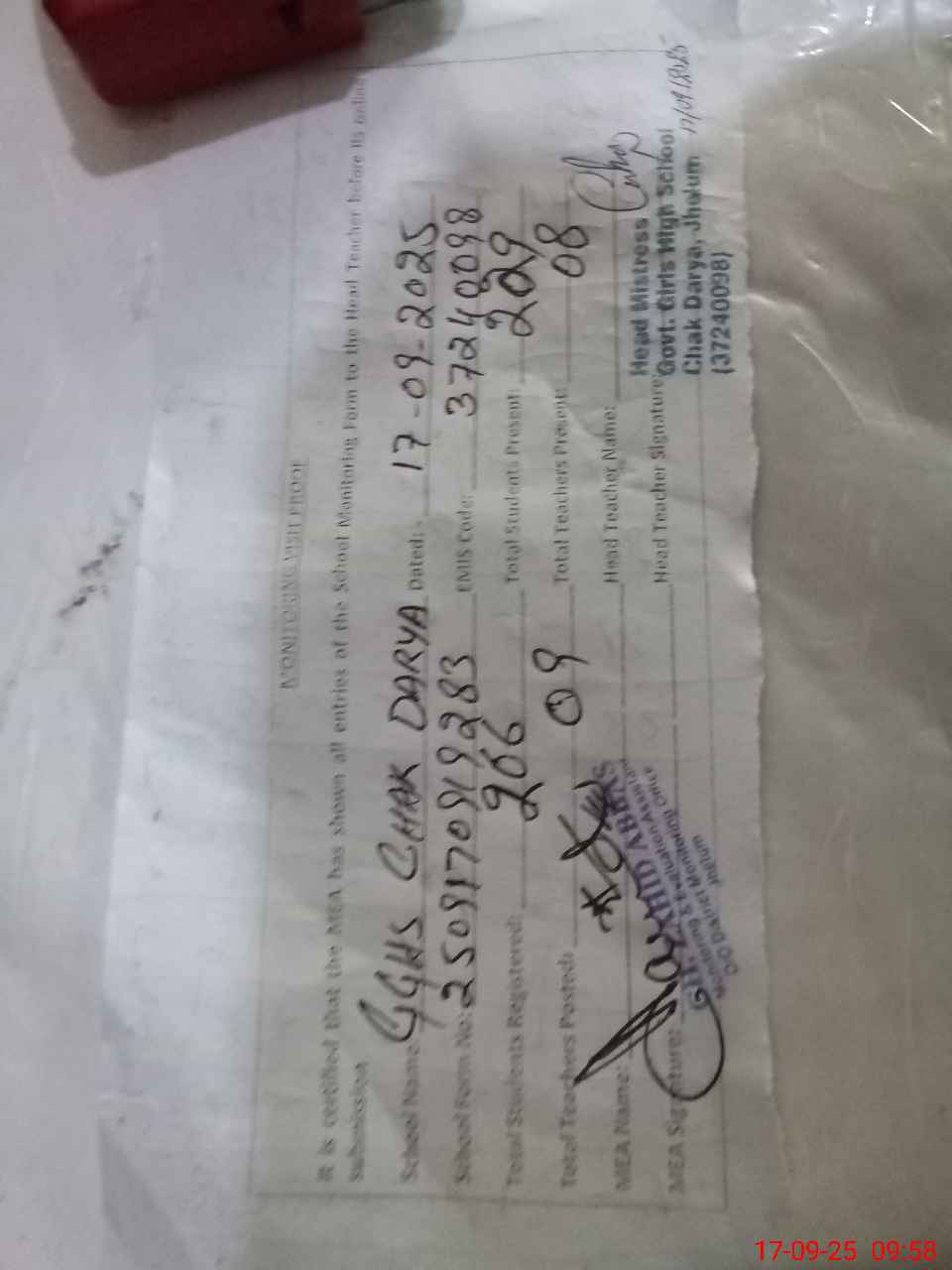 | Attendance Register | Head Teacher | MEA with School | Visit Proof |
