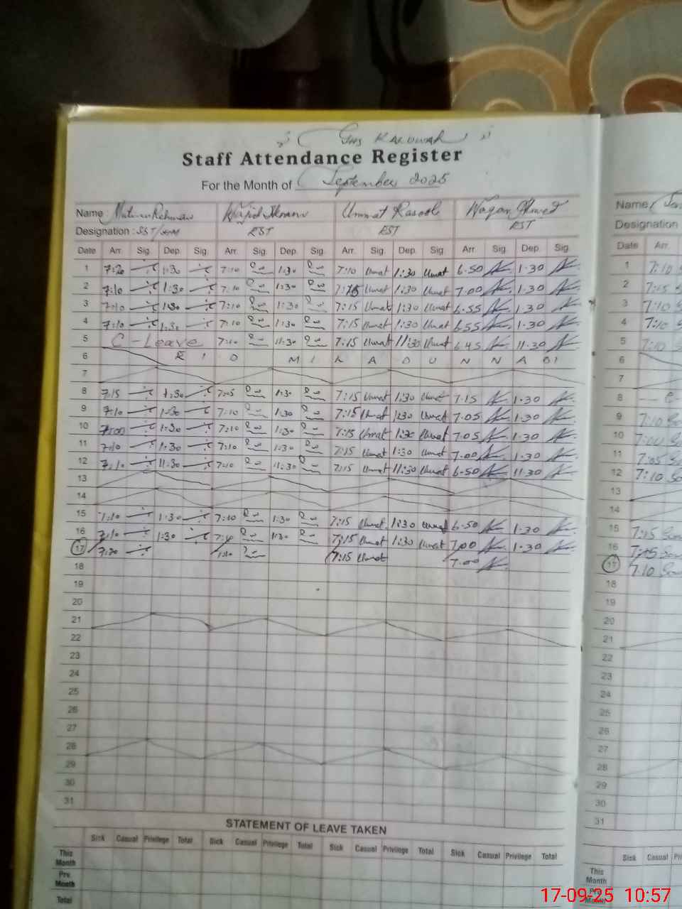 | CNIC | Full Name | Designation | R/C | Absence During Last Calender Month |