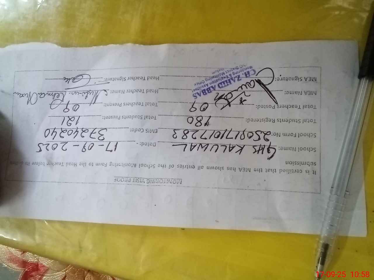 | EMIS Code: 37240240 | Name of School: GHS KALUWAL | |||