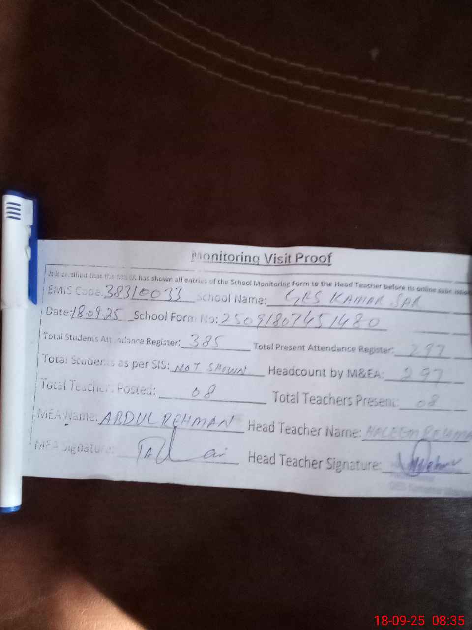 | Attendance Register | Head Teacher | MEA with School | Visit Proof |