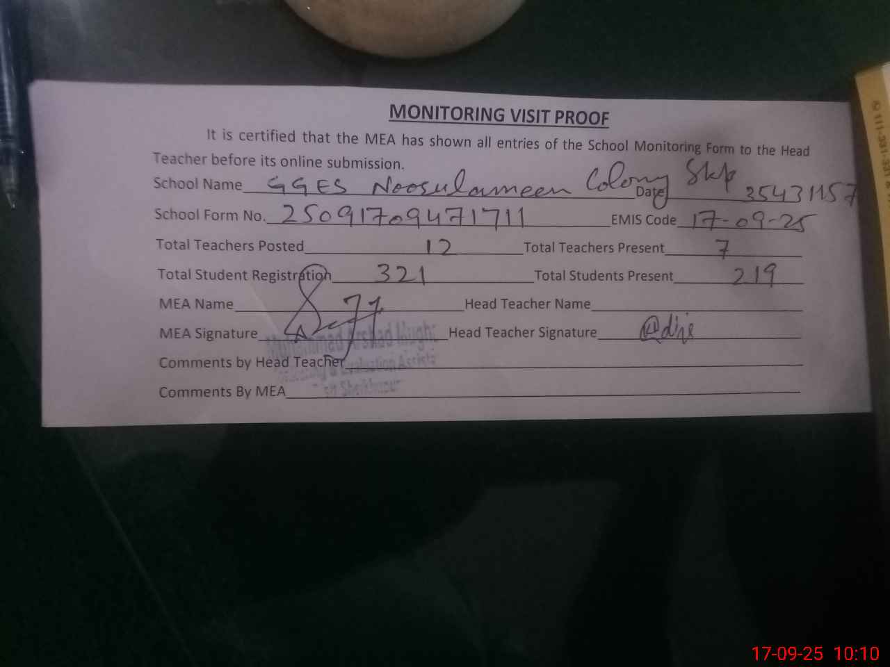 | Attendance Register | Head Teacher | MEA with School | Visit Proof |