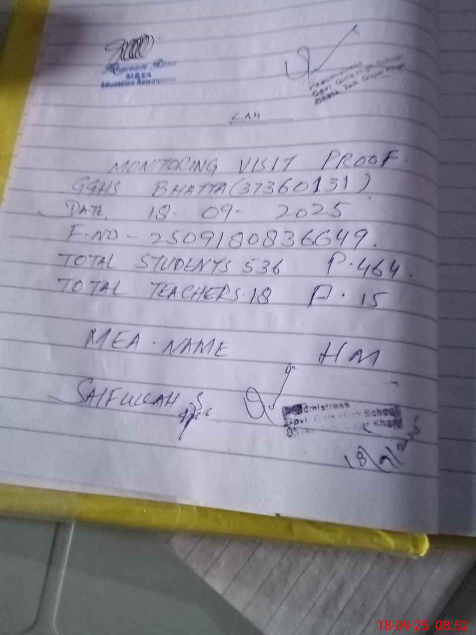 | Attendance Register | Head Teacher | MEA with School | Visit Proof |
