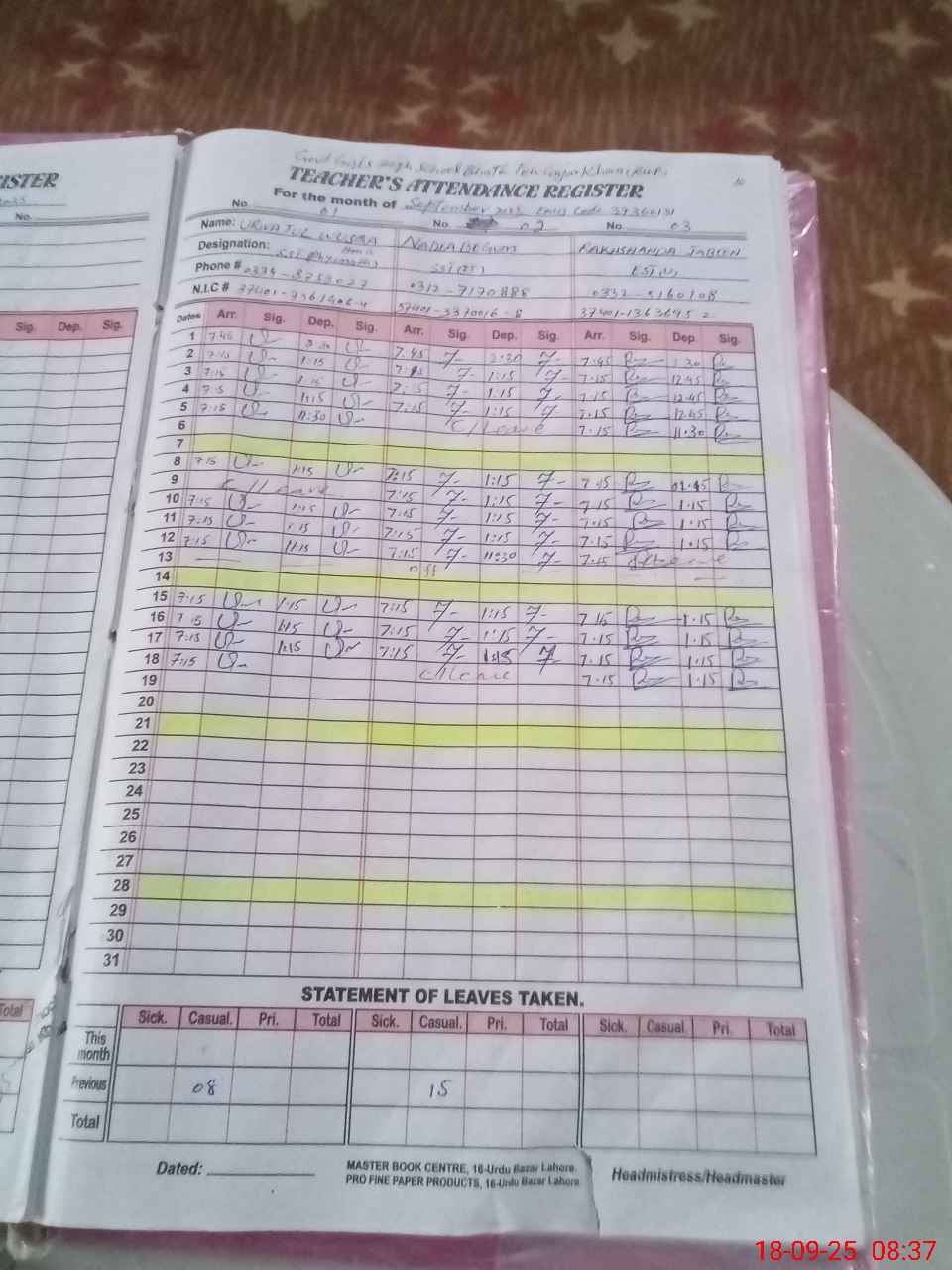 | Name: UR**** TU**** WA**** Designation: (School Headmaster's/Headmistress's) SST (S) Phone/Cell Number: 03**** |
