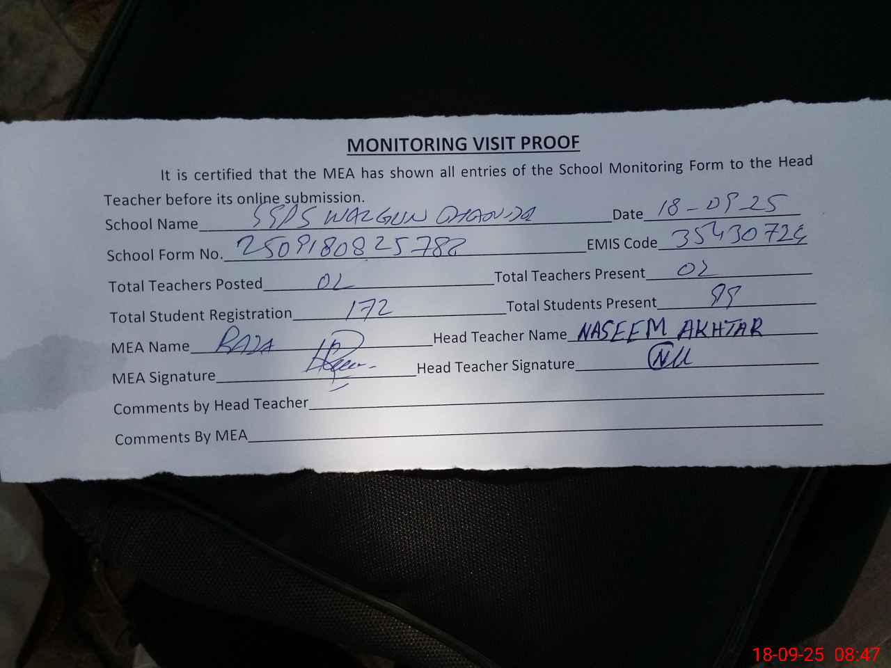 | Attendance Register | Head Teacher | MEA with School | Visit Proof |