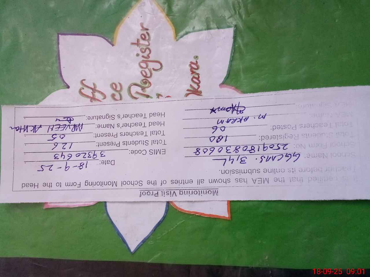 | Attendance Register | Head Teacher | MEA with School | Visit Proof |