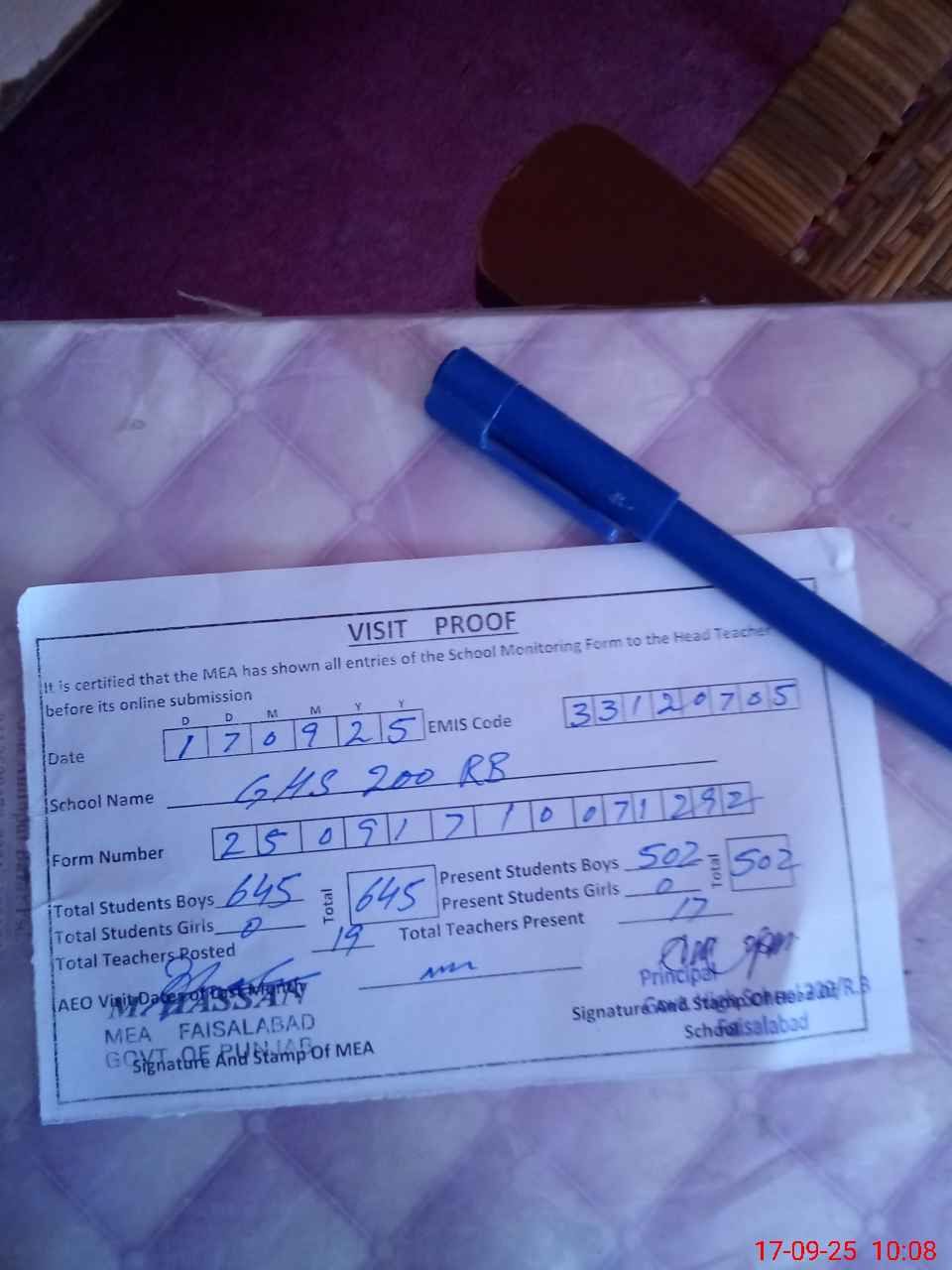 | Attendance Register | Head Teacher | MEA with School | Visit Proof |