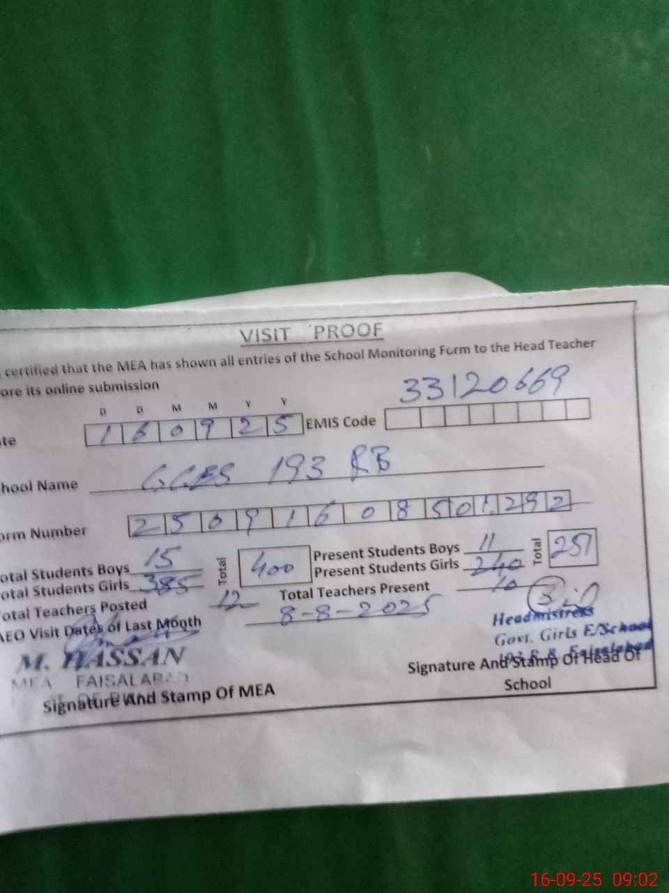 | Attendance Register | Head Teacher | MEA with School | Visit Proof |
