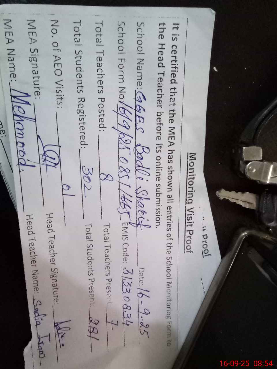 | Attendance Register | Head Teacher | MEA with School | Visit Proof |