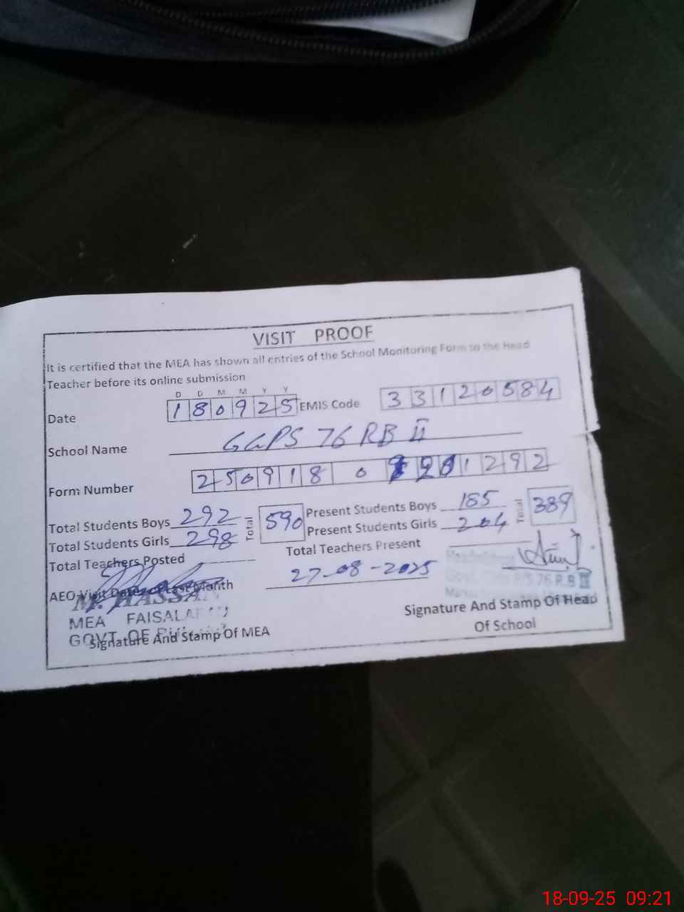 | Attendance Register | Head Teacher | MEA with School | Visit Proof |