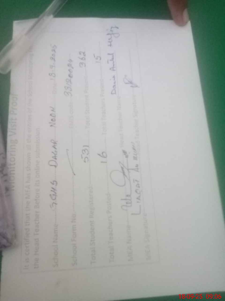 | Attendance Register | Head Teacher | MEA with School | Visit Proof |