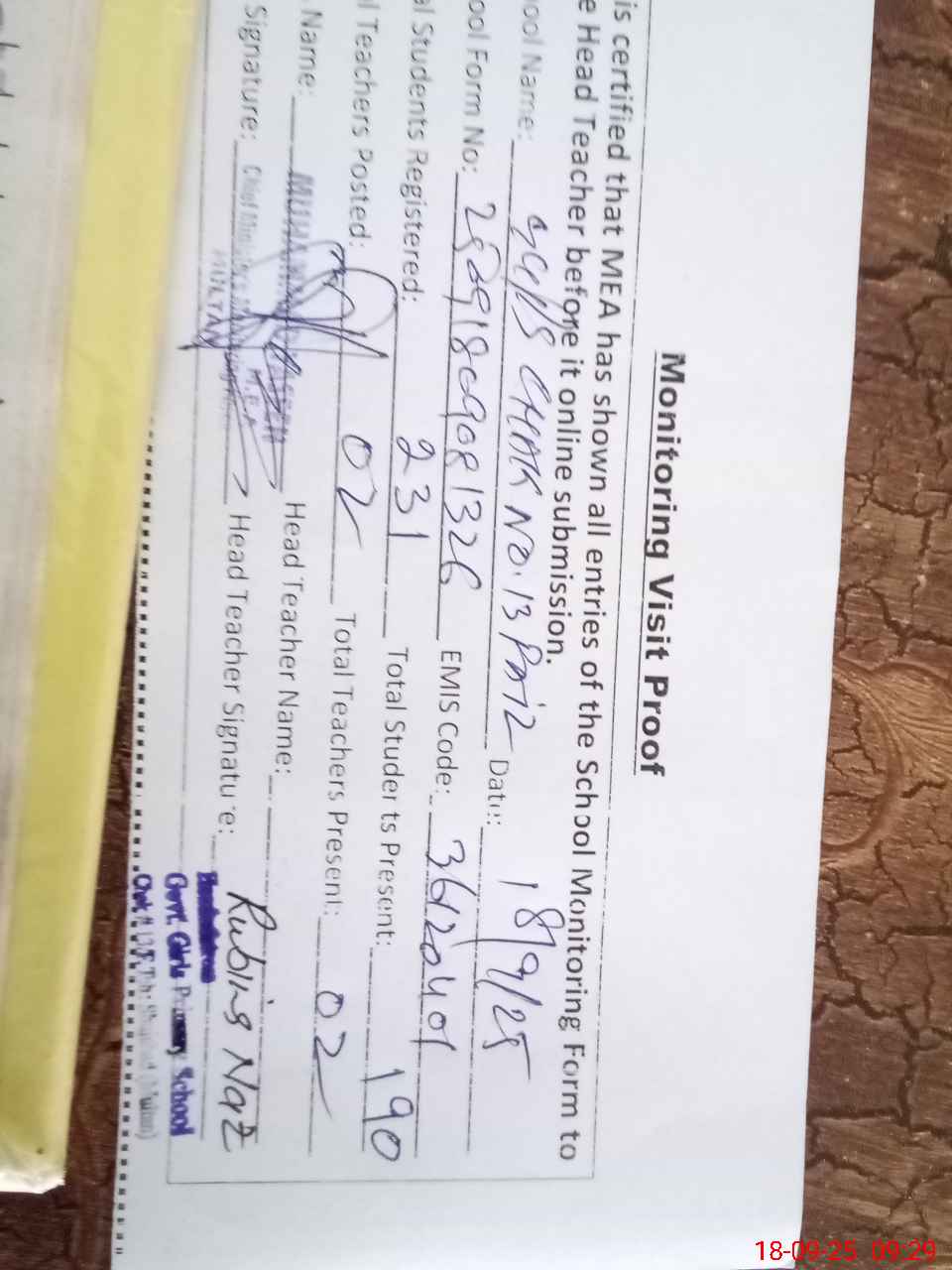| Attendance Register | Head Teacher | MEA with School | Visit Proof |