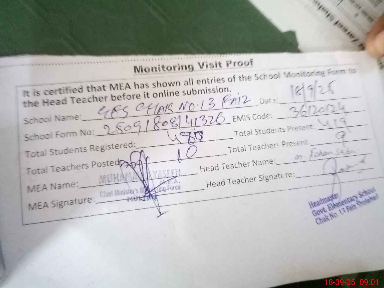 | Attendance Register | Head Teacher | MEA with School | Visit Proof |