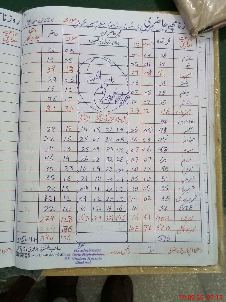 | Total Students Present | 22 | 11 | 76 | 35 | 46 | 34 | 32 | 29 | 36 | 16 | 29 | 19 | 20 | 405 | ||