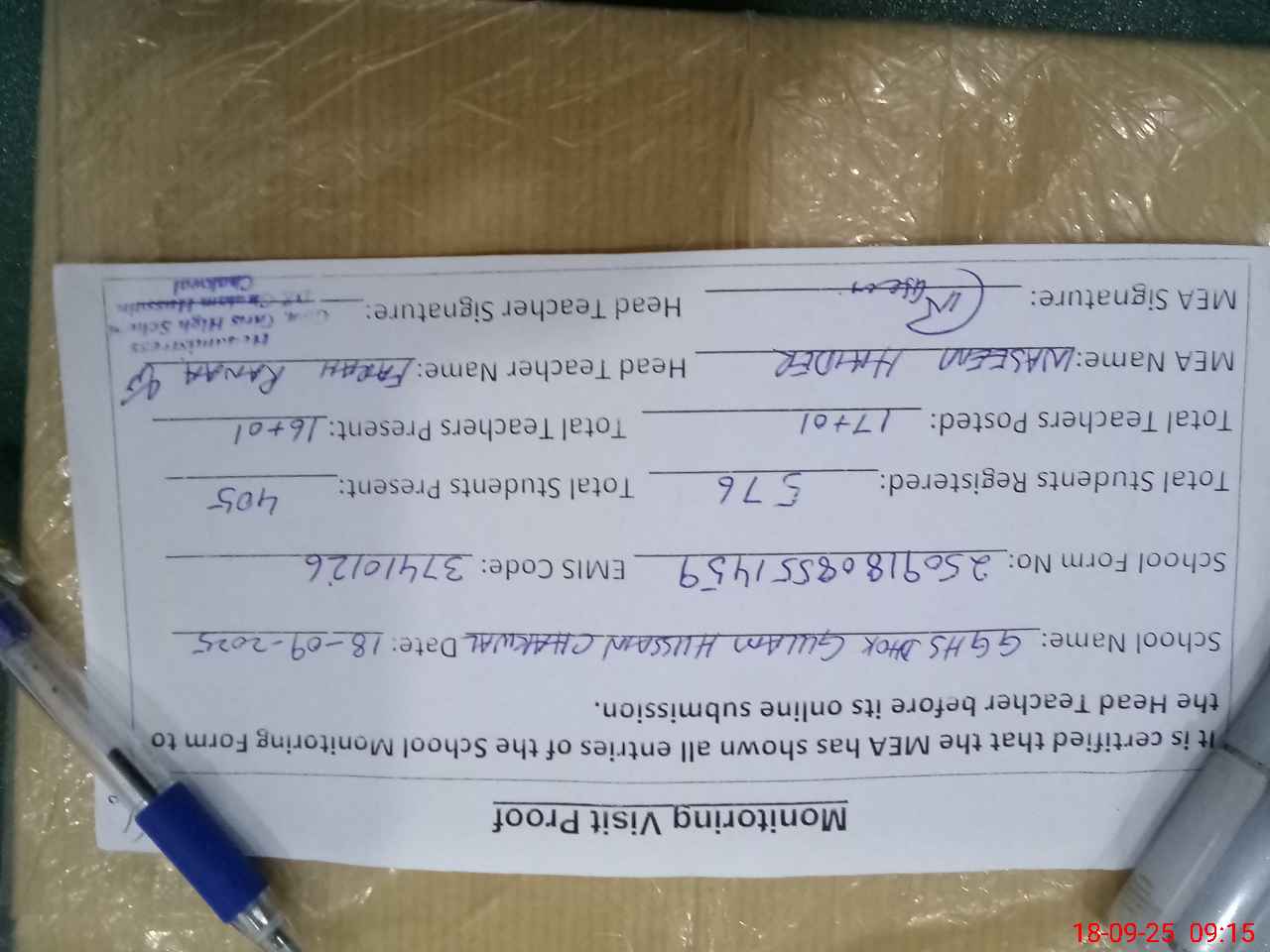 | Attendance Register | Head Teacher | MEA with School | Visit Proof |