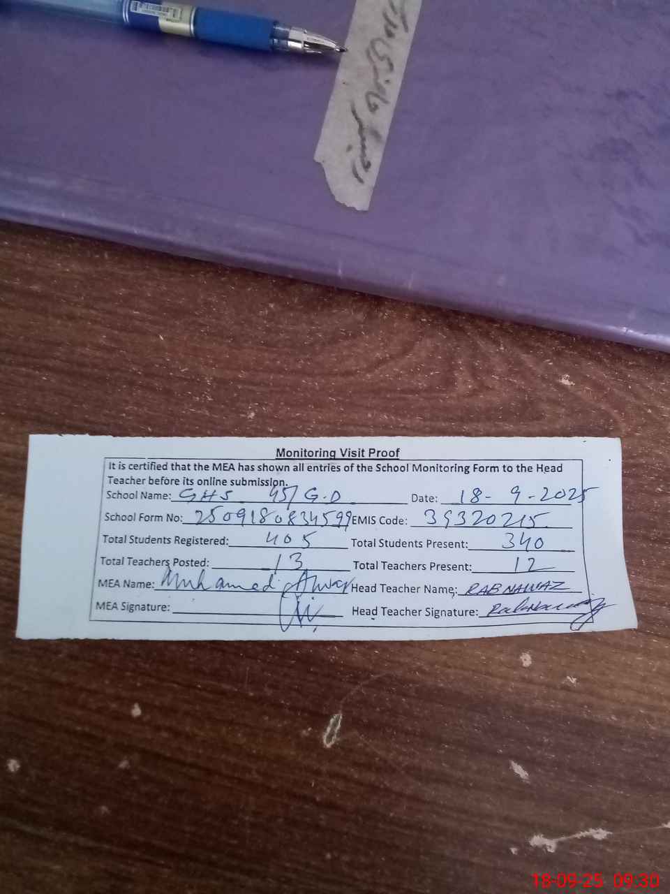 | Attendance Register | Head Teacher | MEA with School | Visit Proof |